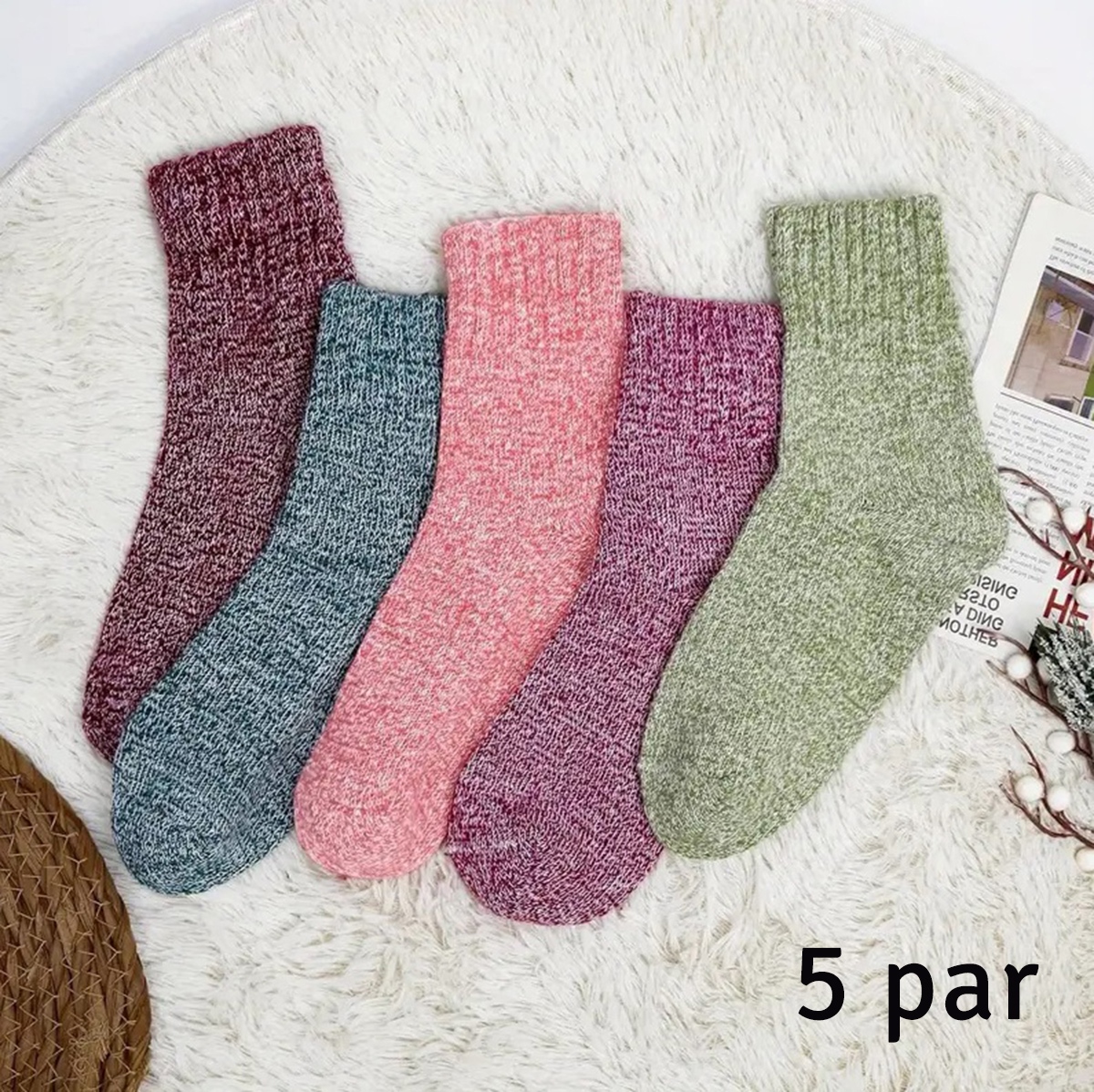 Un set de 5 perechi de șosete de iarnă pentru femei, realizate dintr-un material gros și călduros, perfect pentru protecția împotriva frigului. Croiala înaltă și banda elastică fermă asigură o fixare stabilă și confort maxim pe parcursul purtării. Materialul respirabil reduce transpirația și menține picioarele uscate și confortabile.
