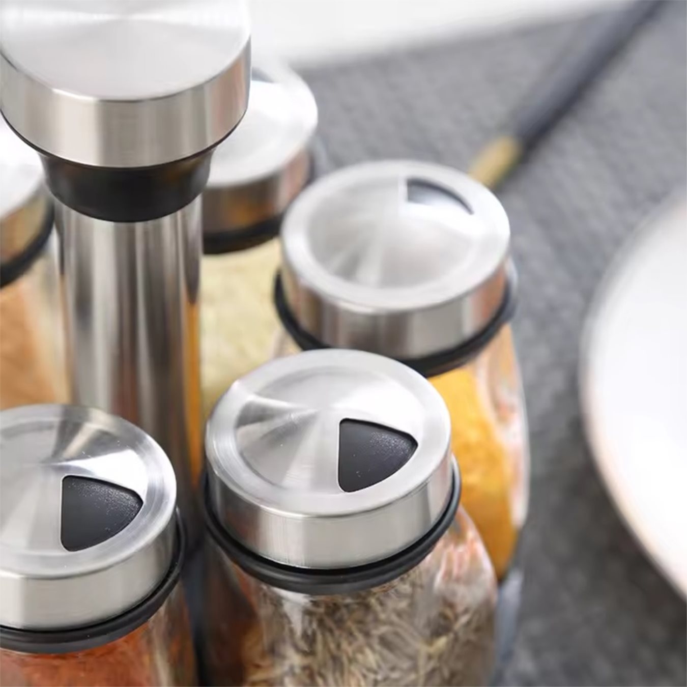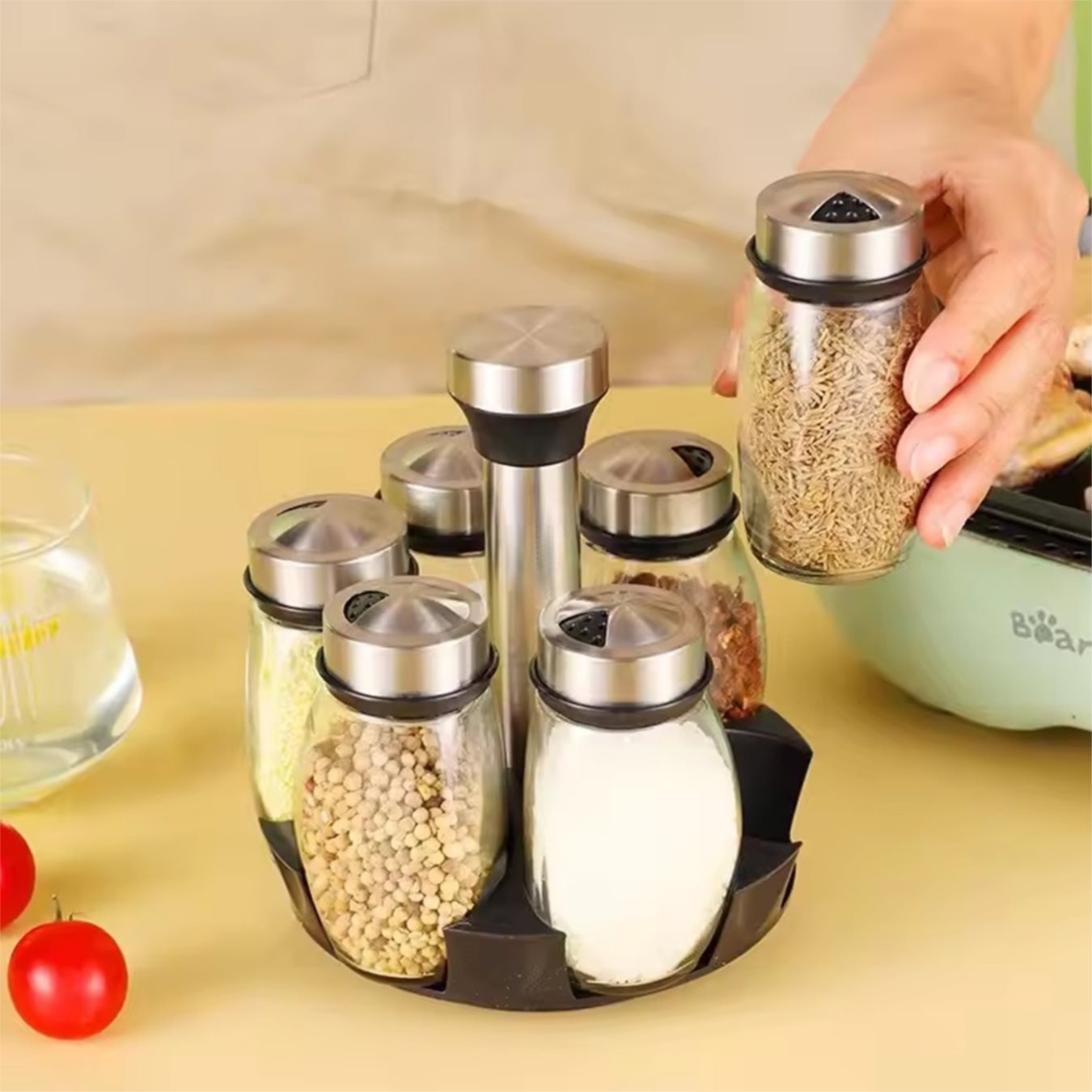 • Set de 6 recipiente transparente pentru condimente, împreună cu o bază rotativă dedicată.